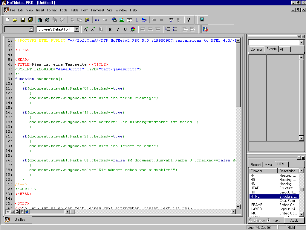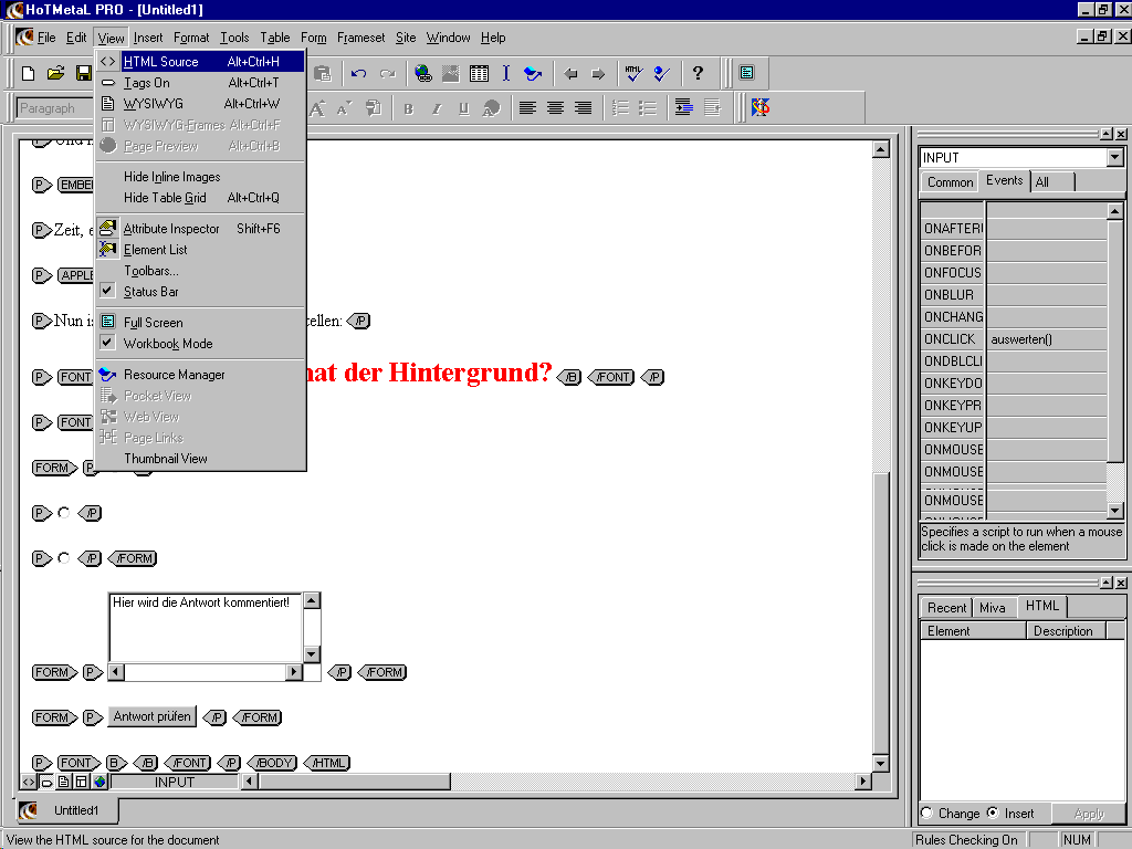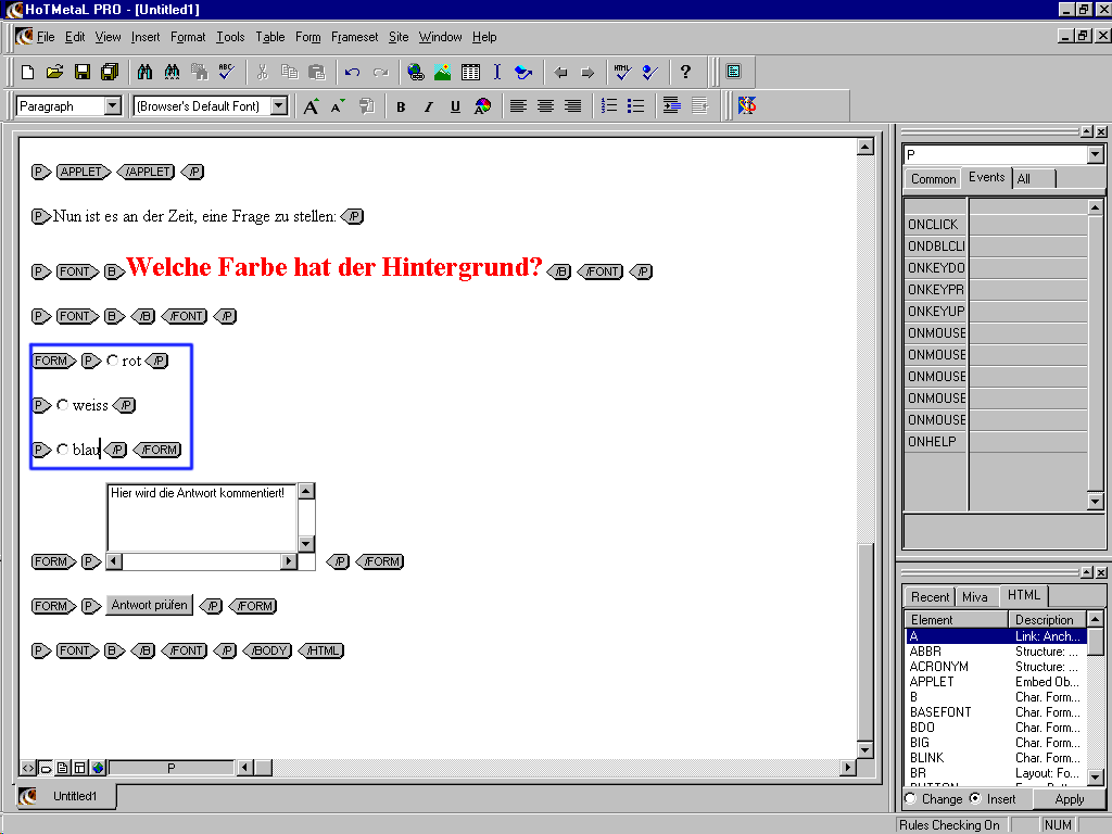 Damit JavaScript auf die einzelnen Formulare zugreifen kann, benötigen die noch einen Namen. Dieser wird wie folgt definiert. Suchen Sie bei den Radiobuttons und anschließend bei der TextArea das Fähnchen mit der Aufschrift "FORM". Klicken Sie mit der rechten Maustaste darauf. Wählen Sie "Attribute Inspector". Im Inspector, rechts im Fenster, geben Sie bei NAME den gewünschten Namen ein: bei den Radiobuttons "Auswahl" und bei der TextArea "text". JavaScript muß leider in den Quellcode der Seite direkt eingegeben werden. Wechseln Sie hierzu in die Quellcode-Ansicht: Menü "View", Befehl "HTML Source".![]() Ein JavaScript wird im sogenannten Header einer HTML-Seite eingegeben. Normalerweise also direkt nach der Zeile mit dem Seitentitel. Schreiben Sie einfach das Script ab, genauso wie aus hier in der Grafik angezeigt wird. Die genaue Beschreibung des Scriptes erfolgt auf einer Zusatzseite. ![]() Zum Schluß brauchen die Radiobuttons noch beschreibenden Text. Wechseln Sie hierzu in die "Tags-On"-Ansicht. Schreiben Sie direkt hinter jeden Button den nötigen Text, wie in der untenstehenden Grafik angezeigt. ![]() So, ihre erste, selbsterstellte HTML-Seite ist nun fertig! Speichern Sie die Seite ab und probieren Sie das Ganze in einem Webbrowser aus. Weitere Informationen zur Web-Programmierung gibt es (auf deutsch) im Internet unter http://www.teamone.de/selfhtml. Sollten Sie noch Fragen haben, oder sollte in der Beschreibung etwas unklar geblieben sein, so können Sie sich jederzeit mit mir in Verbindung setzen: Joerg.Bogendoerfer@physik.uni-erlangen.de. Ich werde Ihnen bestimmt antworten. Allerdings kann das durchaus ein paar Tage dauern. Viel Spaß Jörg Bogendörfer |