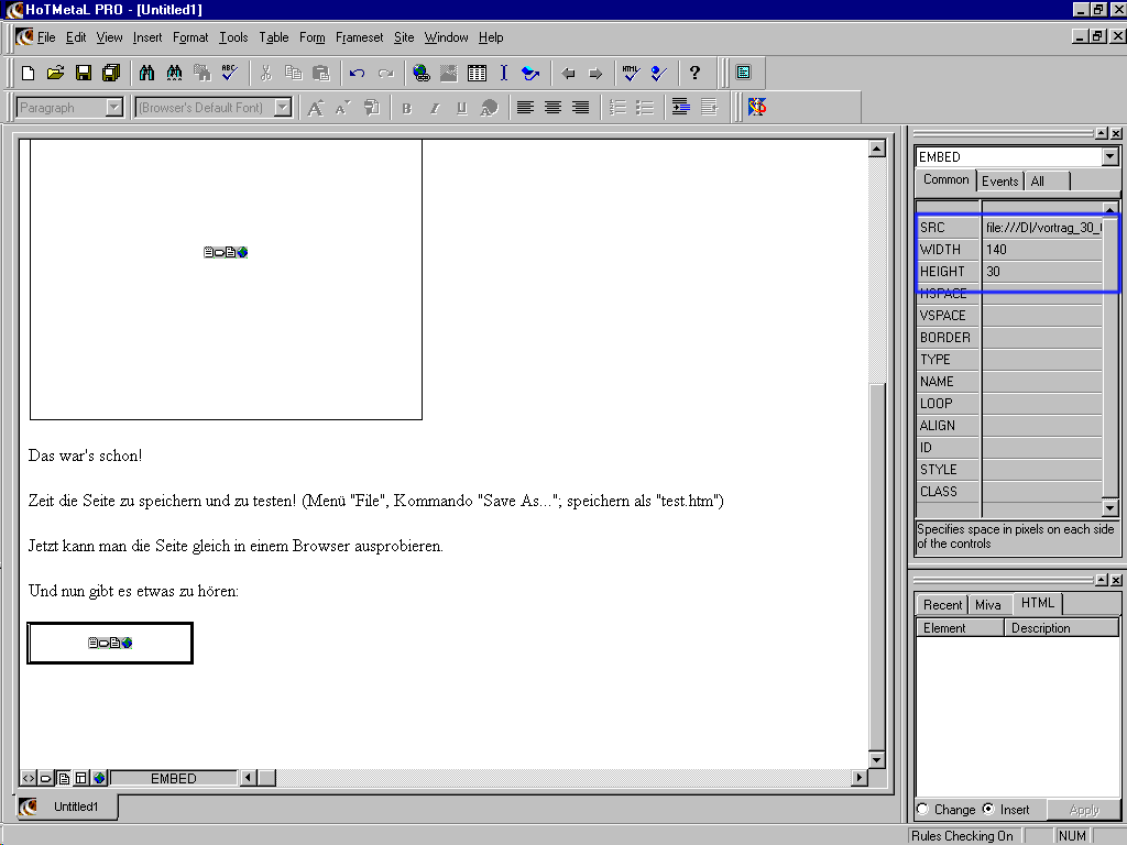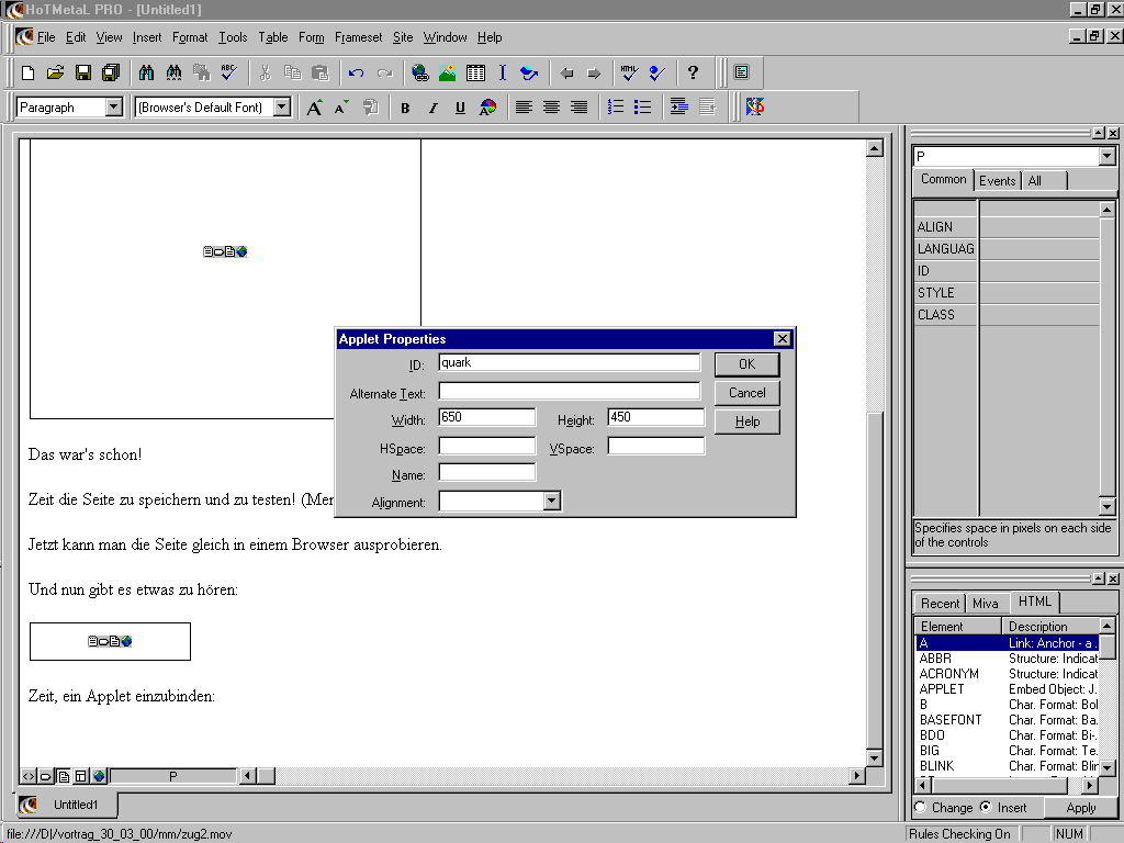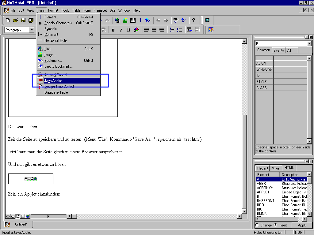 Wiederum wird eine Grafik in das Arbeitsfenster eingefügt. Klicken Sie mit der rechten Maustaste darauf und wählen Sie im erscheinenden Kontextmenü "Attribute Inspector". Im rechten, oberen Fenster sind dann wiederum die drei Felder "src", "height" und "width" auszufüllen. Die Quelldatei (bei "src" einzutragen) sollte im *.wav Format sein. Height und Width charakterisieren diesmal nur die Größe der Bedienelemente zum Abspielen der Audiodatei. ![]() Als nächstes wird nun ein Java-Applet in die Seite eingefügt. Klicken Sie hierzu im Menü "Insert" auf den Befehl "JavaApplet...". ![]() Es erscheint ein Datei-Öffnen Dialog. Wählen Sie das gewünschte Java-Applet aus (Datei endet auf *.class). Klicken Sie auf "Öffnen". Daraufhin erscheint ein Fenster mit dem Titel "Applet Properties". Hier geben Sie noch die Höhe und die Breite des Applets an. Klicken Sie auf "OK". Falls das Applet nicht vollständig angezeigt wird, können Sie diese Werte nachträglich ändern: Dazu die erzeugte Datei noch einmal mit HotMetal Pro laden, auf das Applet-Symbol im Arbeitsfenster klicken und rechts im Attribute Inspector die Werte für "height" und "width" anpassen. ![]() Weiter geht es auf der nächsten Seite! |